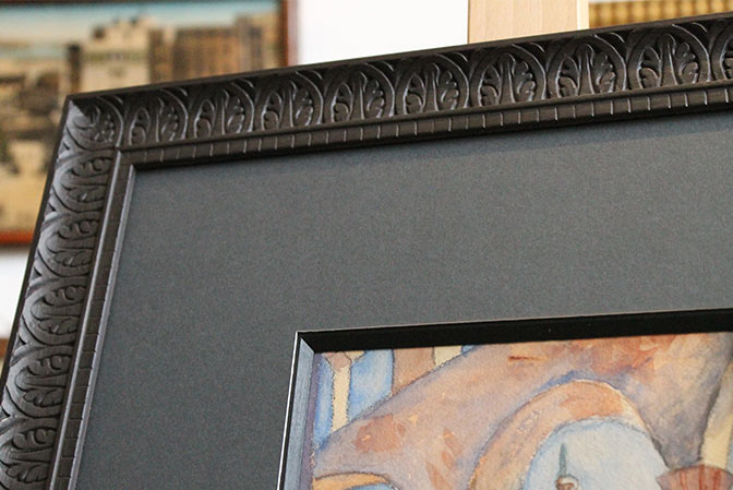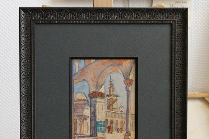 Biseau anglé pour cette aquarelle orientaliste du début XXème. Le biseau est teinté afin de retrouver la couleur de la baguette ornée de motifs orientaux. Le passe partout est sombre afin d’accentuer la sensation d’ombre et de lumière liée à la position de l’artiste sous les arcades et regardant vers la cour très lumineuse. Le verre anti-reflets est indispensable ici pour éviter l’effet de miroir avec le passe-partout sombre et surtout pour conserver les douces couleurs de l’aquarelle.