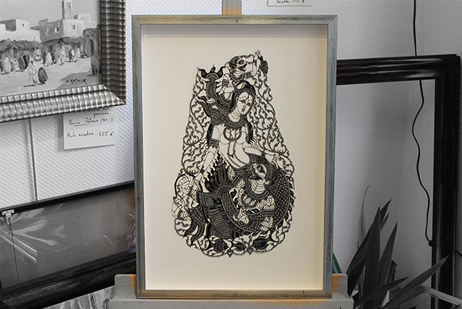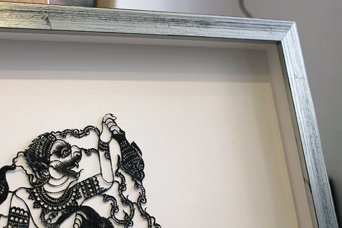 Boitage classique avec une baguette en argent « froissé » pour ce cuir sculpté rapporté de Thaïlande. La hauteur de la baguette permet de donner de la profondeur au sujet et d’éviter de plaquer la vitre sur le sujet. La profondeur est donnée par des bandes de passe-partout collées à la baguette.