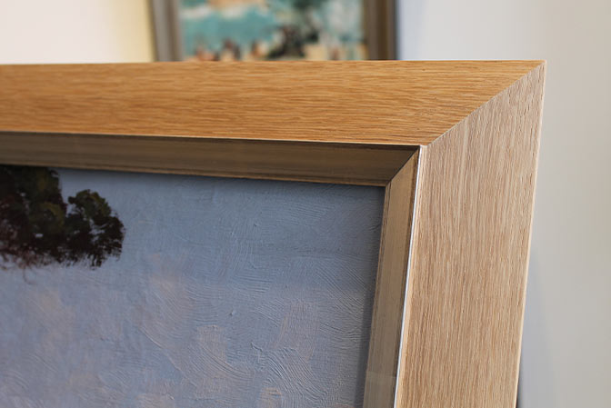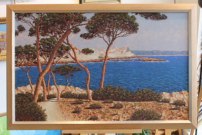 Magnifique cadre en chêne et argent véritable pour cette huile sur toile du Cap d’Antibes.
