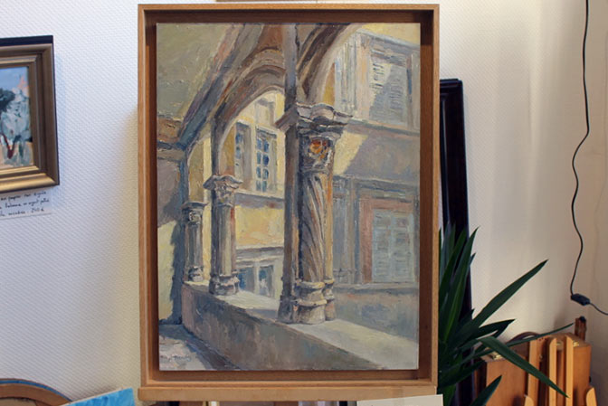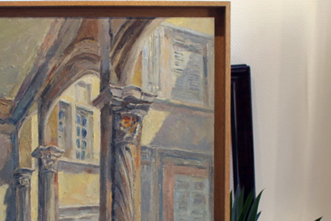 Caisse américaine en chêne brut pour cette huile sur carton entoilé d’André Pardon d’une cour renaissance de Villefranche sur Saône